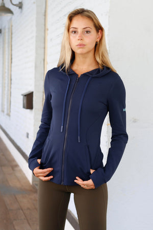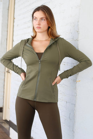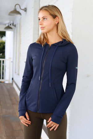 • 4-way stretch, hood with drawstring, two front pockets, and thumbholes at the ends of the sleeves