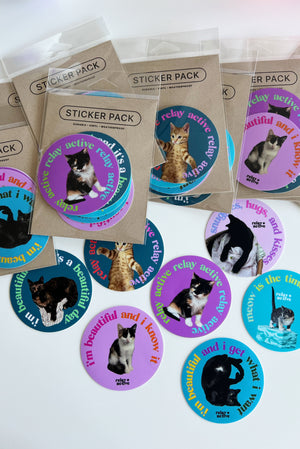 Includes 7 (yes, that's right, SEVEN!) vinyl waterproof stickers featuring different cat graphics (each pack includes one of each of the 7 designs shown here).