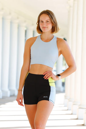 This special super limited edition of the Madison Pocket Shorts is part of our FeelSoft™ Collection and features a colorblock design with black, neon yellow, and baby blue.