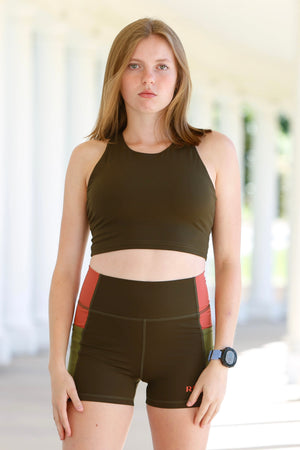Pair these shorts with the Kella Pocket Crop Top in army and the Camryn Run Bra in pine/clay/amethyst.