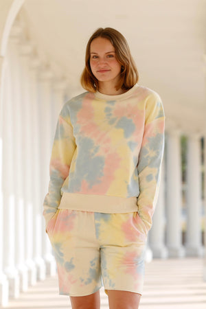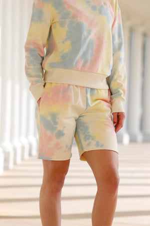 Made of 100% French terry cotton featuring a sherbet tie-dye colorway (with subtle glitter in it!), these are the cutest, most unique, adorable sweatshorts around. Features include raw hem on bottom for style, embroidered logo patch, and two big deep pockets.