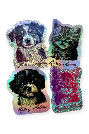 Personalize your water bottle, laptop, phone case, or training log with our holographic and glitter stickers! 1% of ALL of Relay Active sales go to animal rescue! In honor of our favorite furchildren, we bring you our cat and dog holographic and glitter sticker pack!