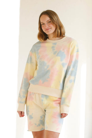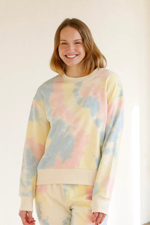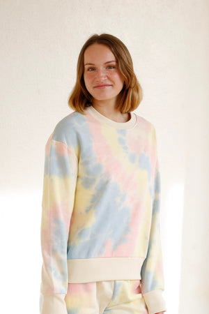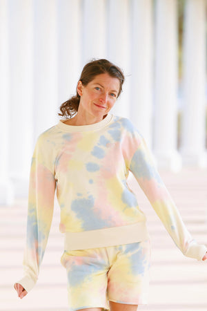 Made of 100% French terry cotton and featuring an extra special sherbet tie-dye colorway with glitter in the fabric, this is an extra special sweatshirt that is super cute and made to be a fav!
