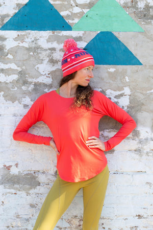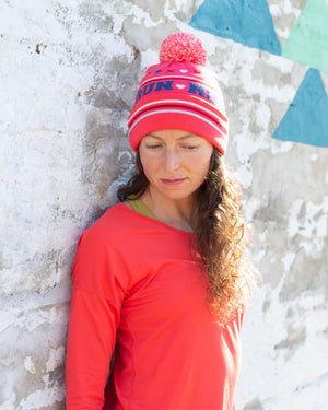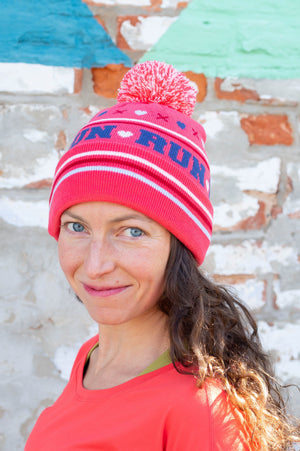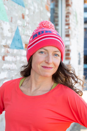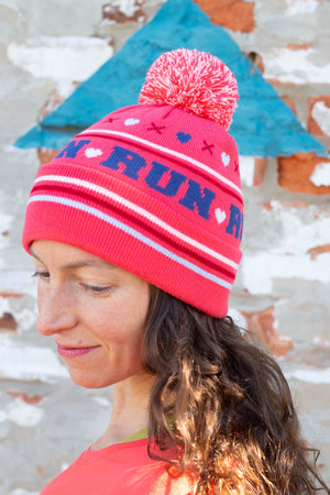 Soft knit pom beanie with RUN wraparoound text. Pair this beanie with the St. Clair Long Sleeve in navy or cherry or pair with any of the Run Wild print collectionsince the colors match!