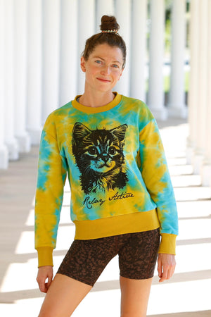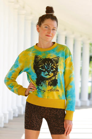 Made of 100% French terry cotton, this sweatshirt also features a beautiful vintage inspired tie-dye colorway (with a subtle glitter embedded in the fabric!) and an adorable kitten screenprint. The purrfect gift for the cat mom in your life!